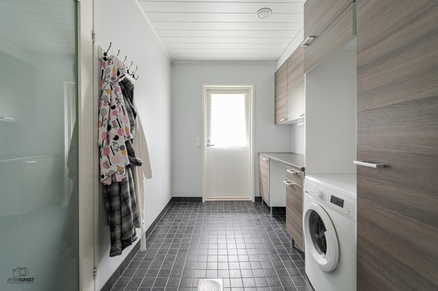 - Tilava kodinhoitohuone, jossa hyvin kaapistotilaa ja työ/laskutasoa, pesukoneliitäntä ja tila pyykinpesukoneelle ja kuivausrummulle. Laatoitettu lattia, lattialämmitys, käynti suoraan ulos sekä kylpyhuoneeseen.