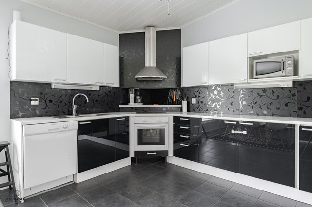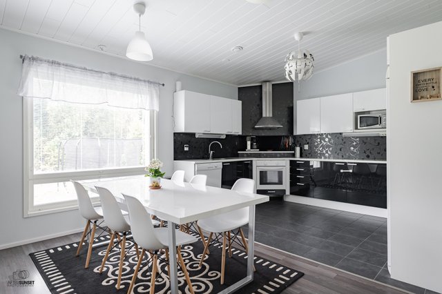 - Avokeittiö on tyylikäs ja värisävyiltään mustavalkoinen. Kaapistoa ja työskentelytasoa on runsaasti. Täyskorkeat jääkaappi ja pakastinkaappi, induktioliesi/uuni, liesituuletin, astianpesukone. Lattia laatoitettu.