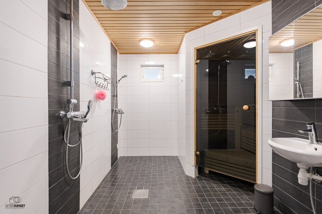 - Laatoitettu, lattialämmitys, ikkuna, tilava pesutila jossa kaksi suihkua, wc istuin, peilikaappi, käsienpesuallas, käynti saunaan.