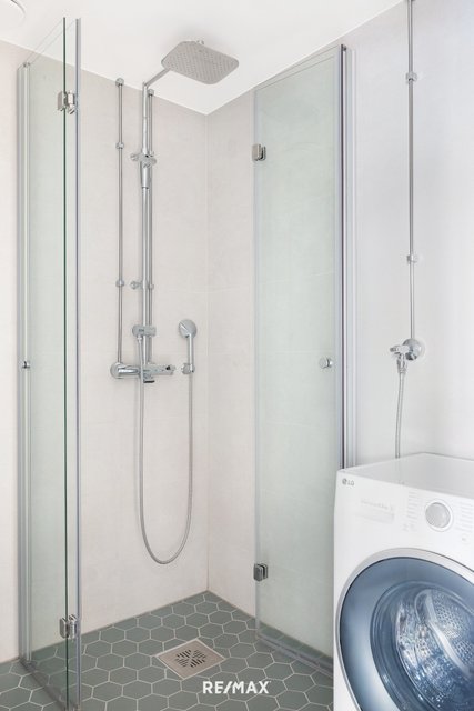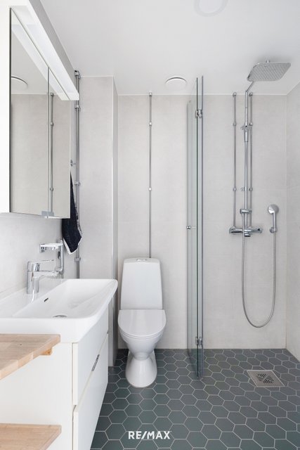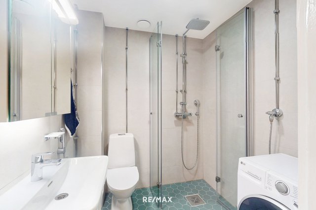 - Tyylikkäässä, linjasaneerauksen yhteydessä uusitussa kylpyhuoneessa on Oraksen sadesuihku, suihkuseinät, wc-istuin, varaus pesukoneelle, lavuaari, allas-ja peilikaappi sekä käsisuihku. Seinät ja lattia ovat laatoitettu.