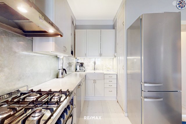 - Tyylikäs keittokomero, jonka varustuksiin kuuluu Italialainen Lofra kaasuliesi- ja uuni (hella toimii kaasulla (kaasupullo), uuni sähköllä, Savo design liesituuletin ja Mielen jääkaappipakastin sekä Mielen astianpesukone. Keittiön tasot ovat marmoria ja välitila betonia, jonka päällä pleksi. Lautalattia ja maalatut seinät.