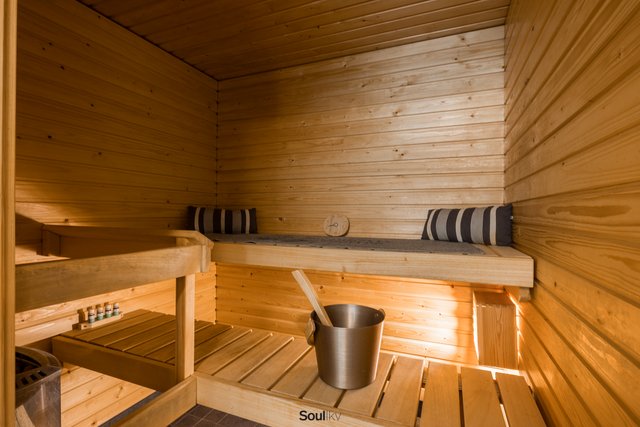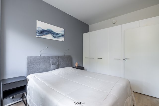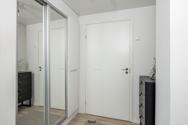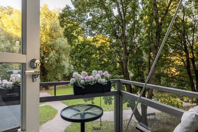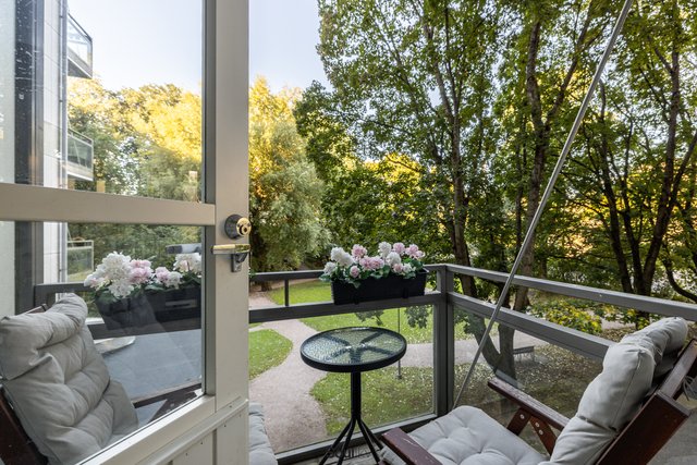 Asuntoon kuuluu sympaattinen parveke, josta avautuvat samat vehreät näkymät puistoon. Tilavan eteisen peililiukuovet tuovat käytännöllistä säilytystilaa, ja eteispöydälle löytyy oma paikkansa. Kylpyhuone on tilava ja siellä on lattialämmitys, paikka pesukoneelle sekä oma sauna.