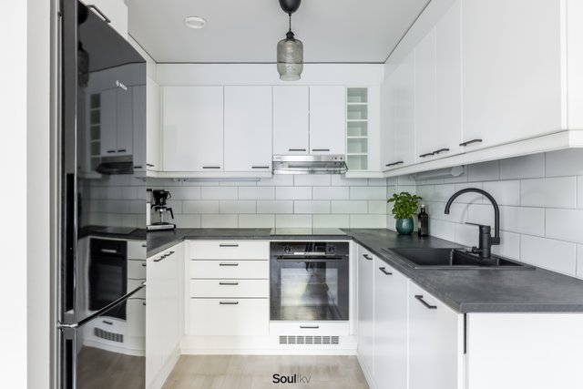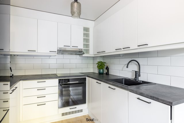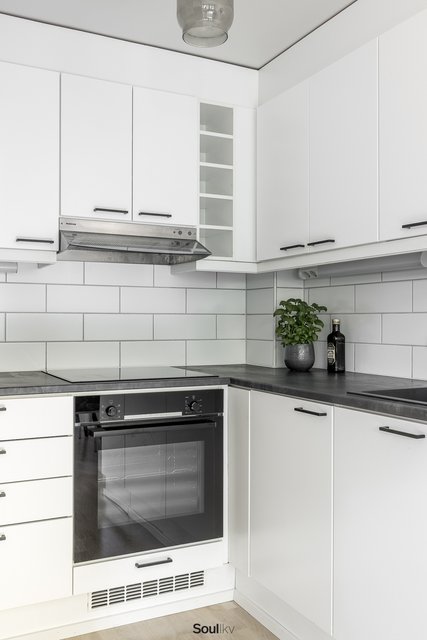 Keittiö on päivitetty ja varusteltu moderneilla kodinkoneilla. Kaappitilaa on runsaasti, ja isommallekin ruokapöydälle löytyy luonteva paikka keittiön yhteydestä.
