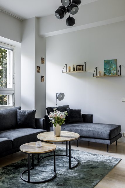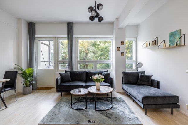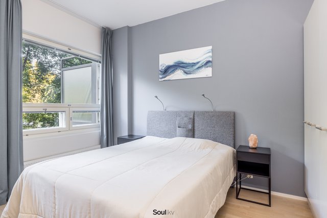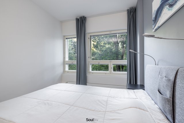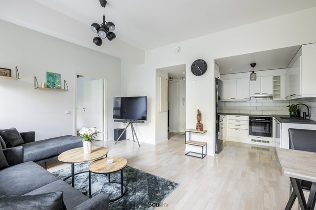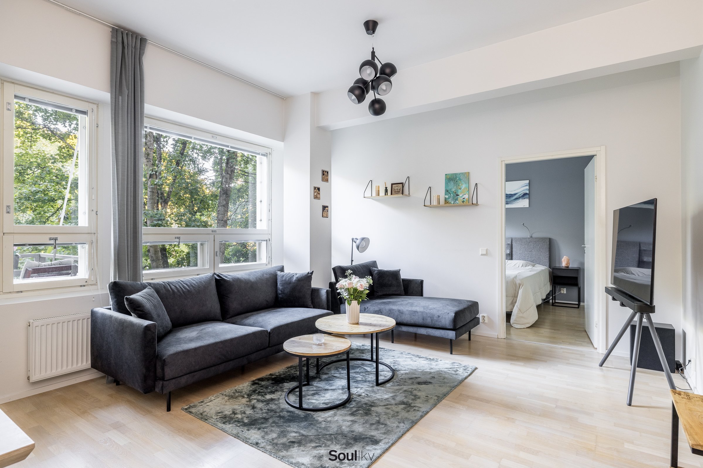Olohuone ja keittiö muodostavat yhtenäisen kokonaisuuden, pitäen tilat kuitenkin hieman erillään. Länteen avautuvista ikkunoista tulvii luonnonvaloa sisään, ja näkymät vehreään puistoon jatkuvat myös makuuhuoneeseen. Makuuhuoneessa on seinän leveydeltä kaapistoja, mikä tuo runsaasti säilytystilaa.
