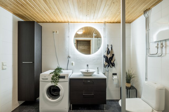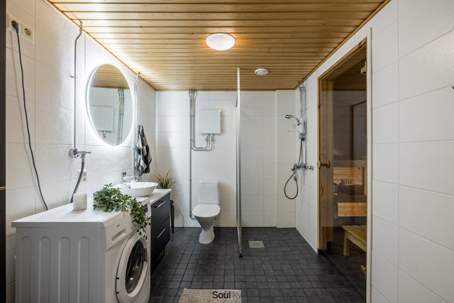 - WC-istuin, suihku, suihkuseinä, pesukoneliitäntä, lattialämmitys, peili, allaskaappi, ja bidee-suihku