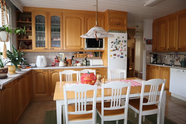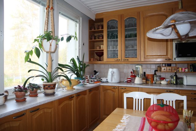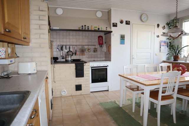 - Tilavan keittiön sydämenä puuhella sekä leivinuuni. Kodinkoneina liesi, jääkaappi ja astianpesukone.