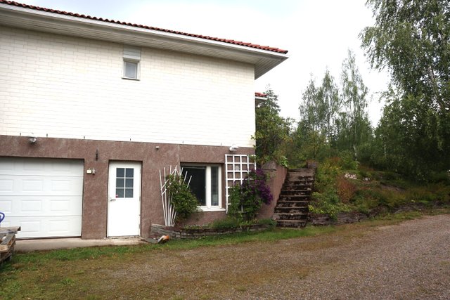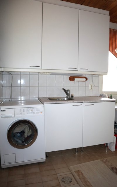 - Kodinhoitohuoneesta uloskäynti talon päätyyn. Kaapistot, pesuallas ja pesukoneliitäntä.