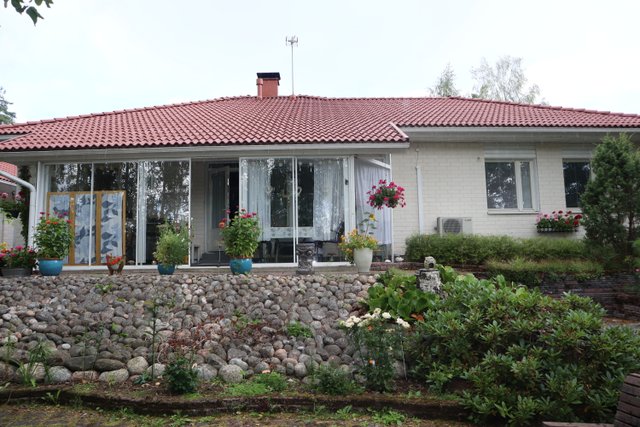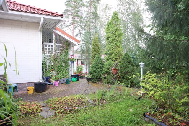 Ihastuttava ja hyvin hoidettu osin rinteinen tontti, jossa paljon kauniita istutuksia sekä kivetyksiä ja puutarhan puolella marjapensaita, hedelmäpuita ja kasvihuone. Lisäksi patio kesäpäivien viettoon. Talon takapihan puolella on reilunkokoinen lasitettu terassi.