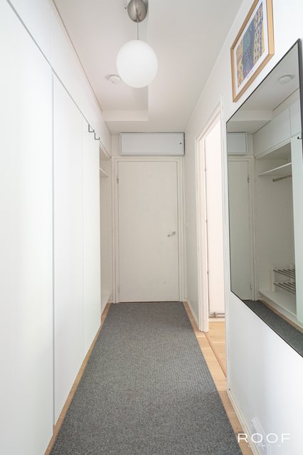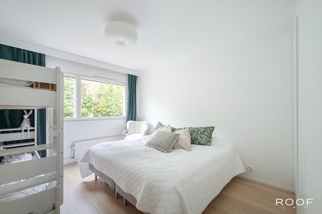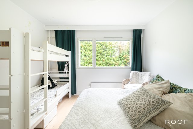 Valoisa makuuhuone tarjoaa erinomaiset säilytystilat kiinteine kaapistoineen, ja tyylikäs kylpyhuone on remontoitu syksyllä 2025 – raikas ja moderni ilme on valmiina uudelle asukkaalle.