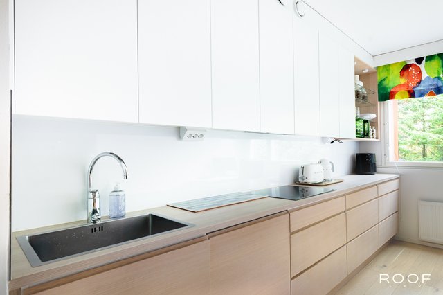 - Tyylikäs, vuonna 2020 saneerattu keittiö. Keittiössä maisemaikkuna. induktioliesi, liesituuletin, uuni, hana, kaapistot, allas, astianpesukone, jääkaappipakastin. Lattia laminaattia, seinät ovat maalattu.
