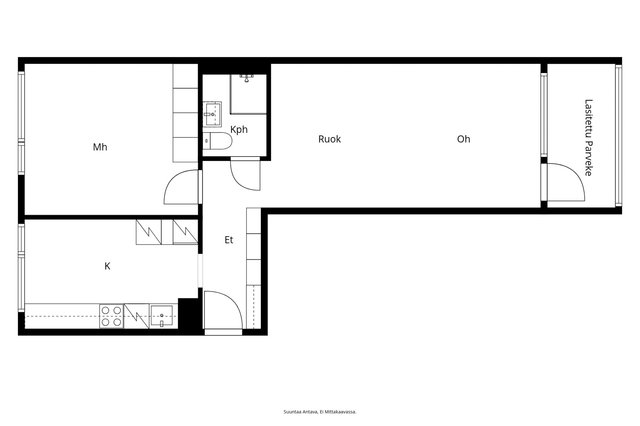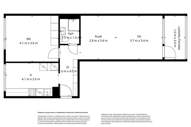 - Pinta-alaa ei ole tarkistusmitattu. Pinta-ala voi olla ilmoitettua suurempi tai pienempi.