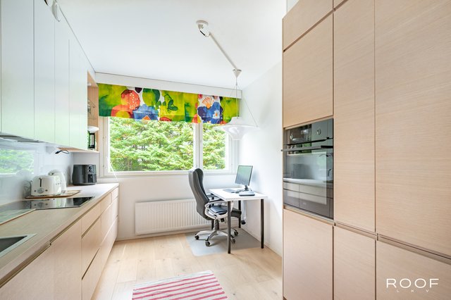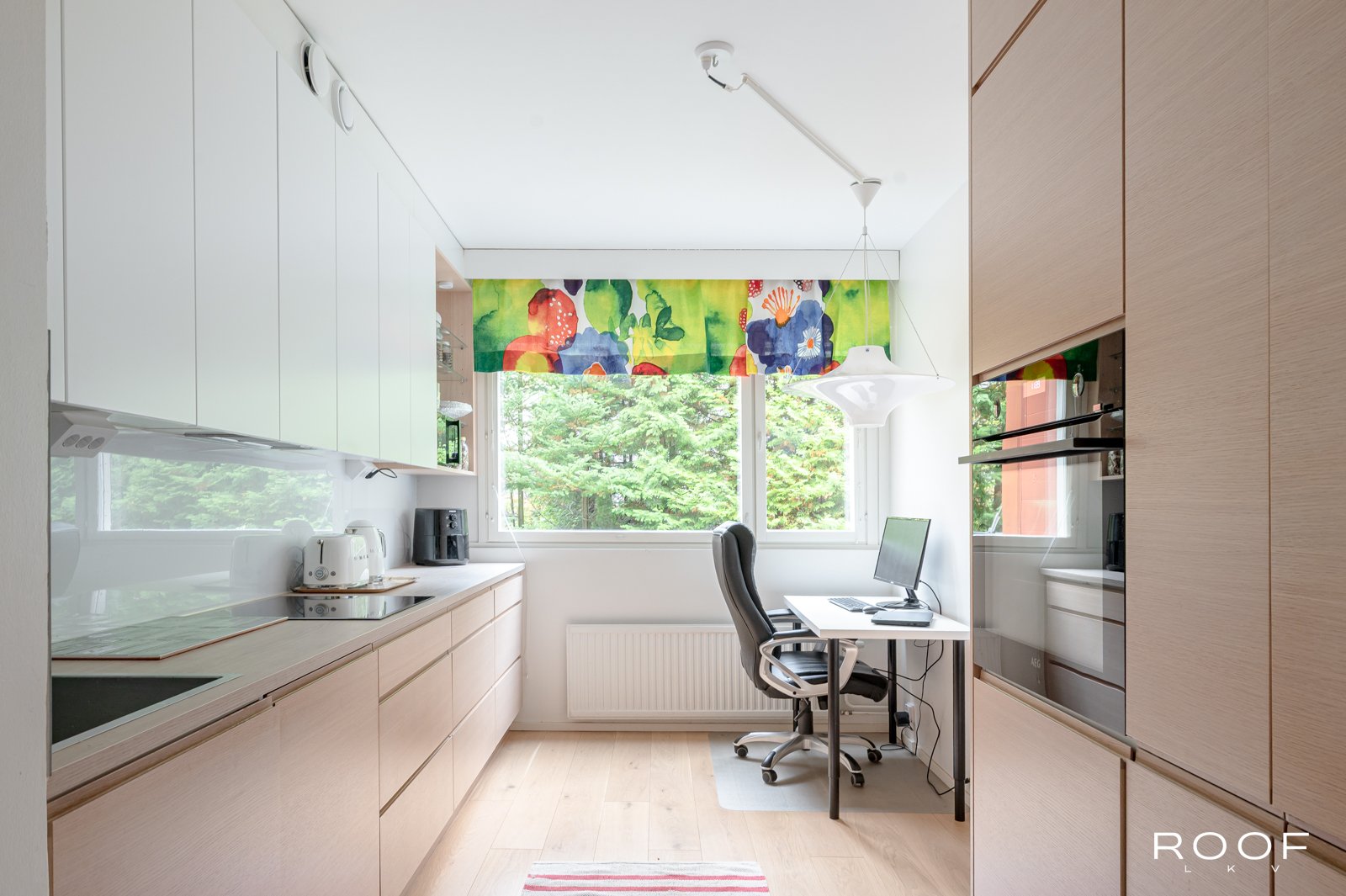Keittiö sijaitsee käytännöllisesti omassa rauhassaan lähellä sisäänkäyntiä. Se on moderni ja tyylikäs: integroidut kodinkoneet, runsaasti kaappi- ja laskutilaa sekä paikka ruokapöydälle tai työpisteelle. Maisemaikkuna tuo runsaasti luonnonvaloa tilaan.
