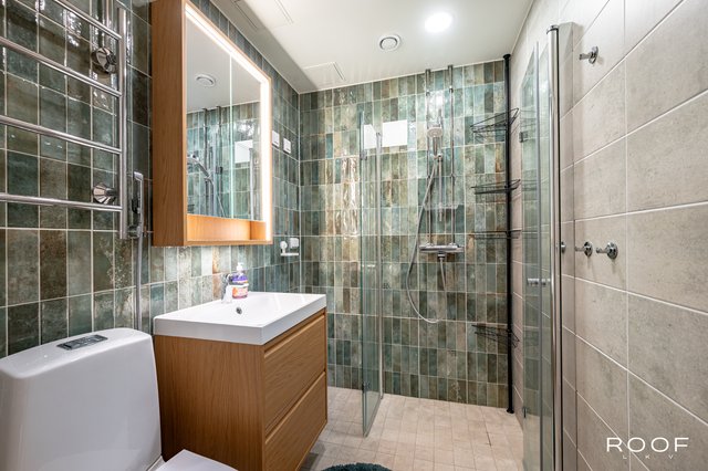 - Kylpyhuoneen saneeraus on valmistunut 09/25. Raikas kylpyhuone, jossa suihku, lasinen suihkuseinä, wc-istuin, pesukoneliitäntä, alla, allas hana, peilikaappi, allaskaappi sekä lattialämmitys. Lattia sekä seinät ovat laatoitettu.