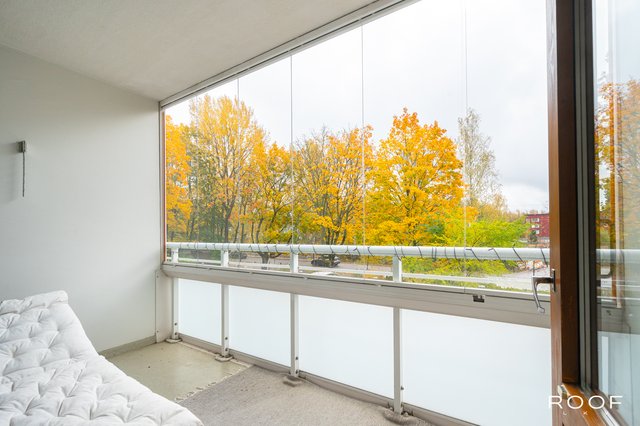 Kodikkaasta olohuoneesta avautuu iso, valoa tulviva ikkuna, ja sieltä on käynti tilavalle lasitetulle parvekkeelle – täydellinen paikka rentoutua.
