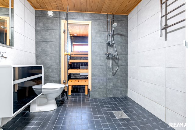 - WC-istuin, suihku, pesukoneliitäntä, peili, allaskaappi, pesuallas, ja bidee-suihku