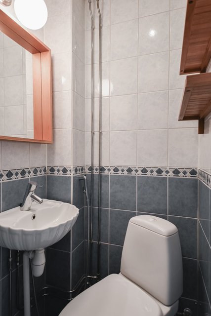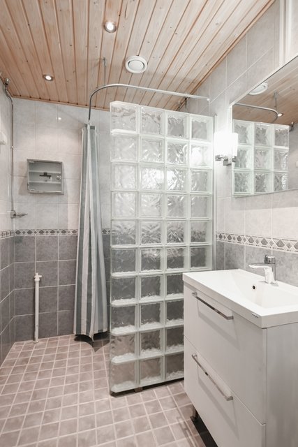 - Suihku, suihkuseinä, pesukoneliitäntä, peili, pesuallas, ja allaskaappi
