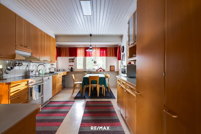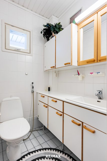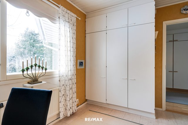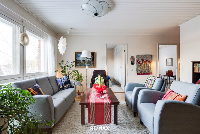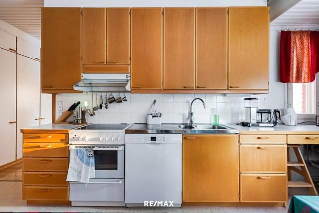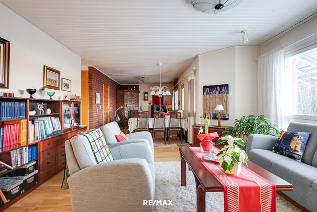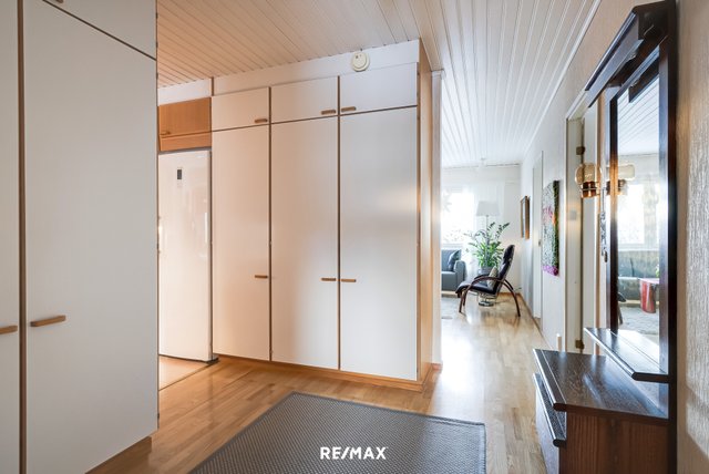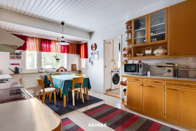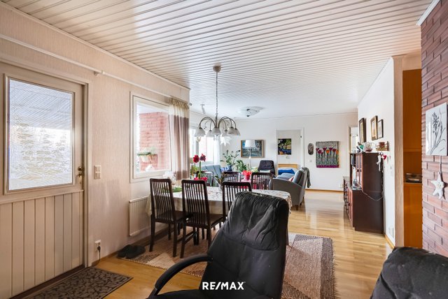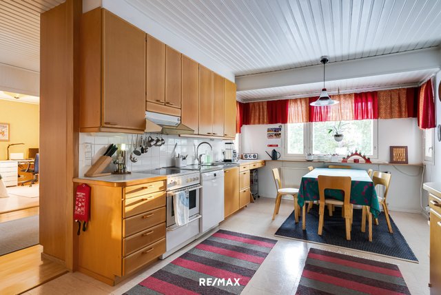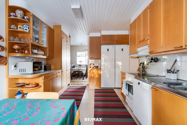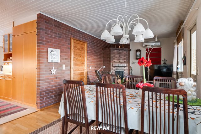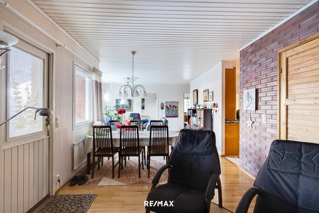 Kodikas olohuone toimii kodin sydämenä, ja varaava takka tuo sekä tunnelmaa että lisälämpöä viileinä iltoina. Keittiö on hyvin varusteltu ja tarjoaa tilaa niin arjen ruoanlaittoon kuin yhteisiin hetkiin. Kylpyhuoneen lattialämmitys lisää asumismukavuutta, ja oma sauna kutsuu rentoutumaan päivän päätteeksi. Käytännöllinen kodinhoitohuone sekä kaksi wc:tä helpottavat arjen toimivuutta.