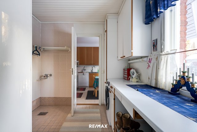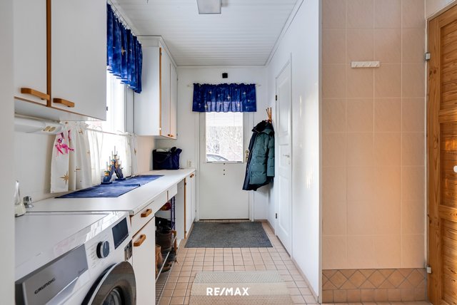 - Pesukone, lattialämmitys, kurapiste, pöytätaso, pyykkikaapit, ja lattiakaivo
