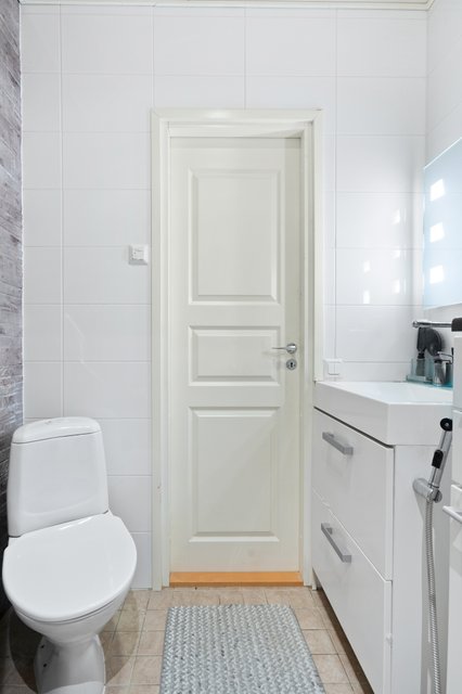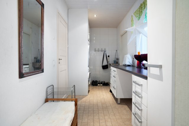 - Lattialämmitys, pesukoneliitäntä, pöytätaso, kurapiste, pyykkikaapit, ja pesuallas