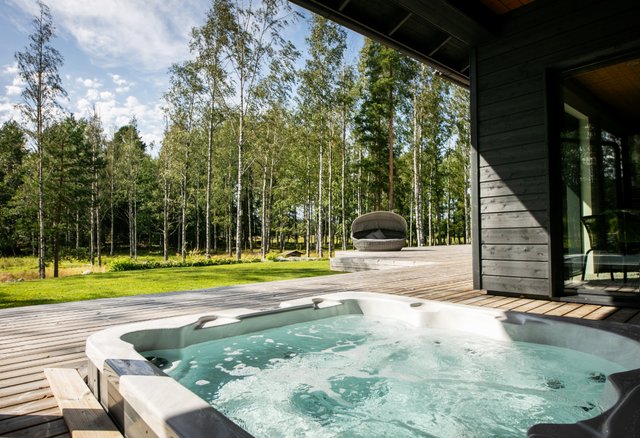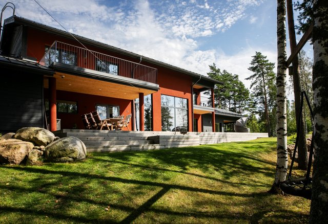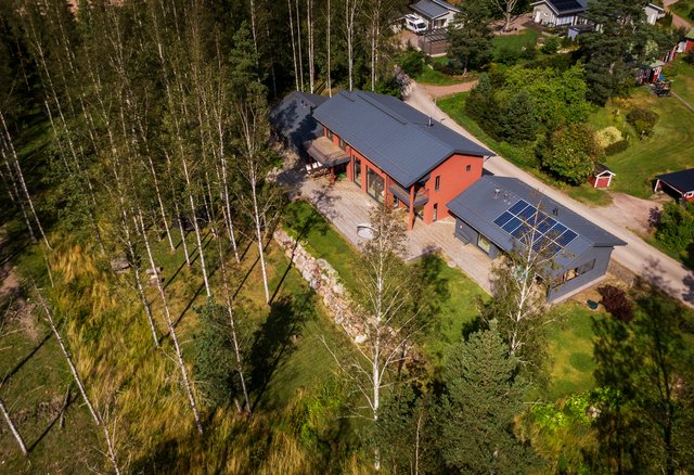 - Erillinen saunarakennus. Autotalli on kytketty päärakennukseen.