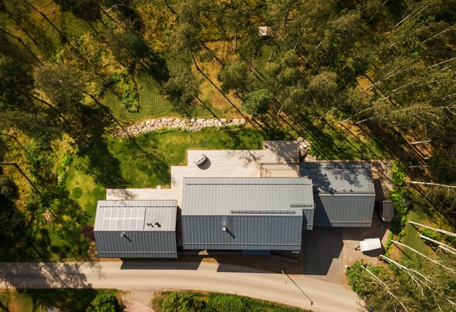 - Aurinkovoimala, paneelit saunarakennuksen katolla.