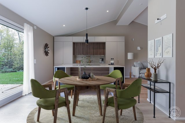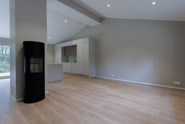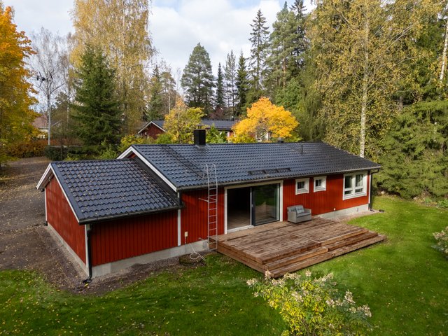 Rakennus on yksitasoinen. Kolme makuuhuonetta, näyttävä avokeittiö-olohuone, missä avarat ikkunat, joista näkymä omalle pihalle. Olohuoneessa tunnelmaa luo takka. Keittiön tasokkaat materiaalit sekä akustiikkapaneloitu tehosteseinä luovat tilaan ajattoman tyylin. Sauna, kylpyhuone sekä erillinen WC on myös remontoitu tasokkailla ja näyttävillä materiaalivalinnoilla.