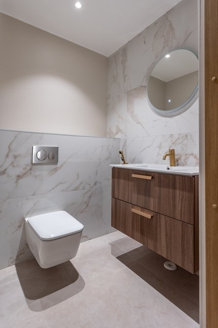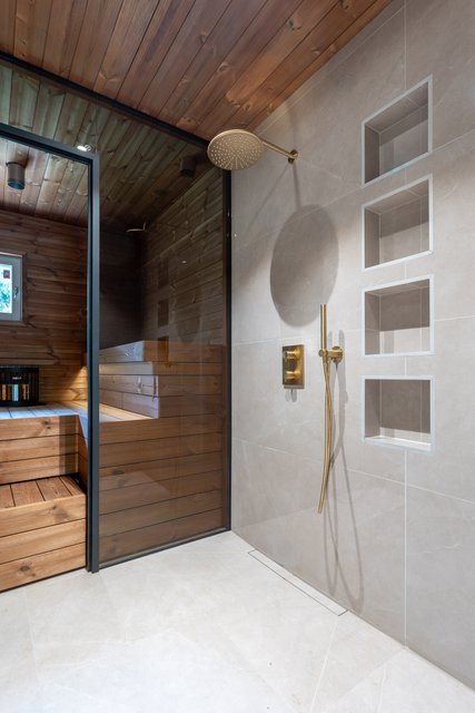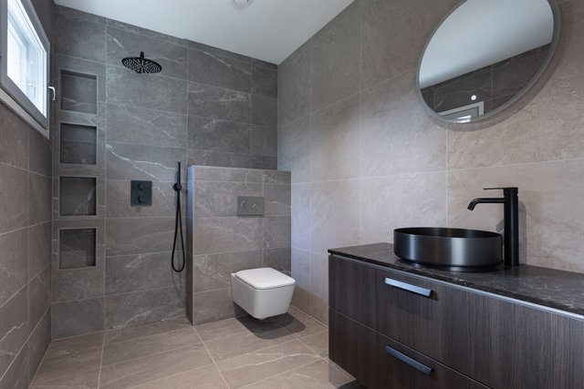 - WC-istuin, suihku, suihkuseinä, lattialämmitys, allaskaappi, bidee-suihku, ja pesuallas