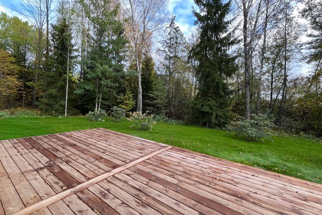 Pihalla on puinen terassi, iso nurmialue sekä autokatos. Pihalle mahtuu niin istutuksia kuin jättitrampoliinikin.