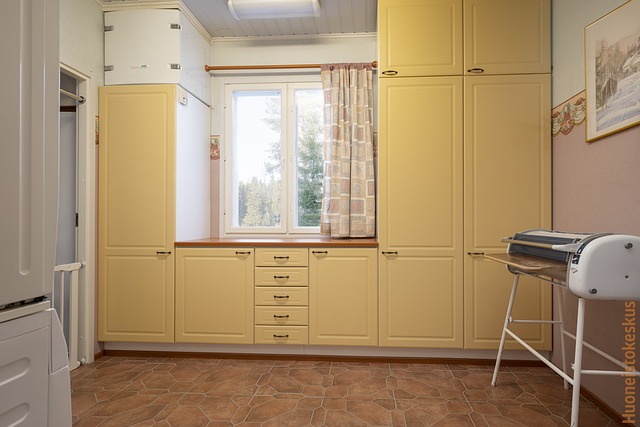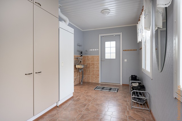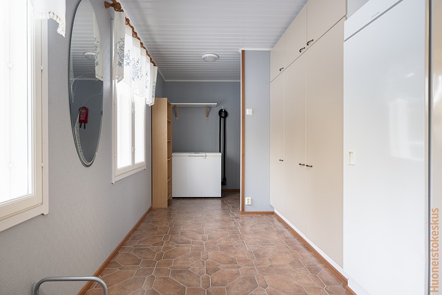 - Pesuallas, kurapiste, lattialämmitys, keskuspölynimuri, pesukoneliitäntä, pyykkikaapit, ja pöytätaso