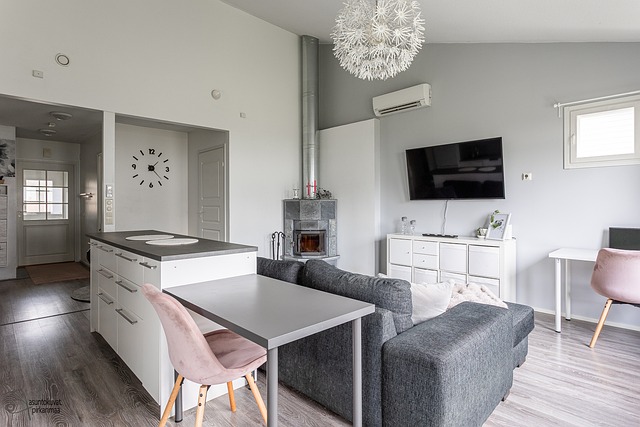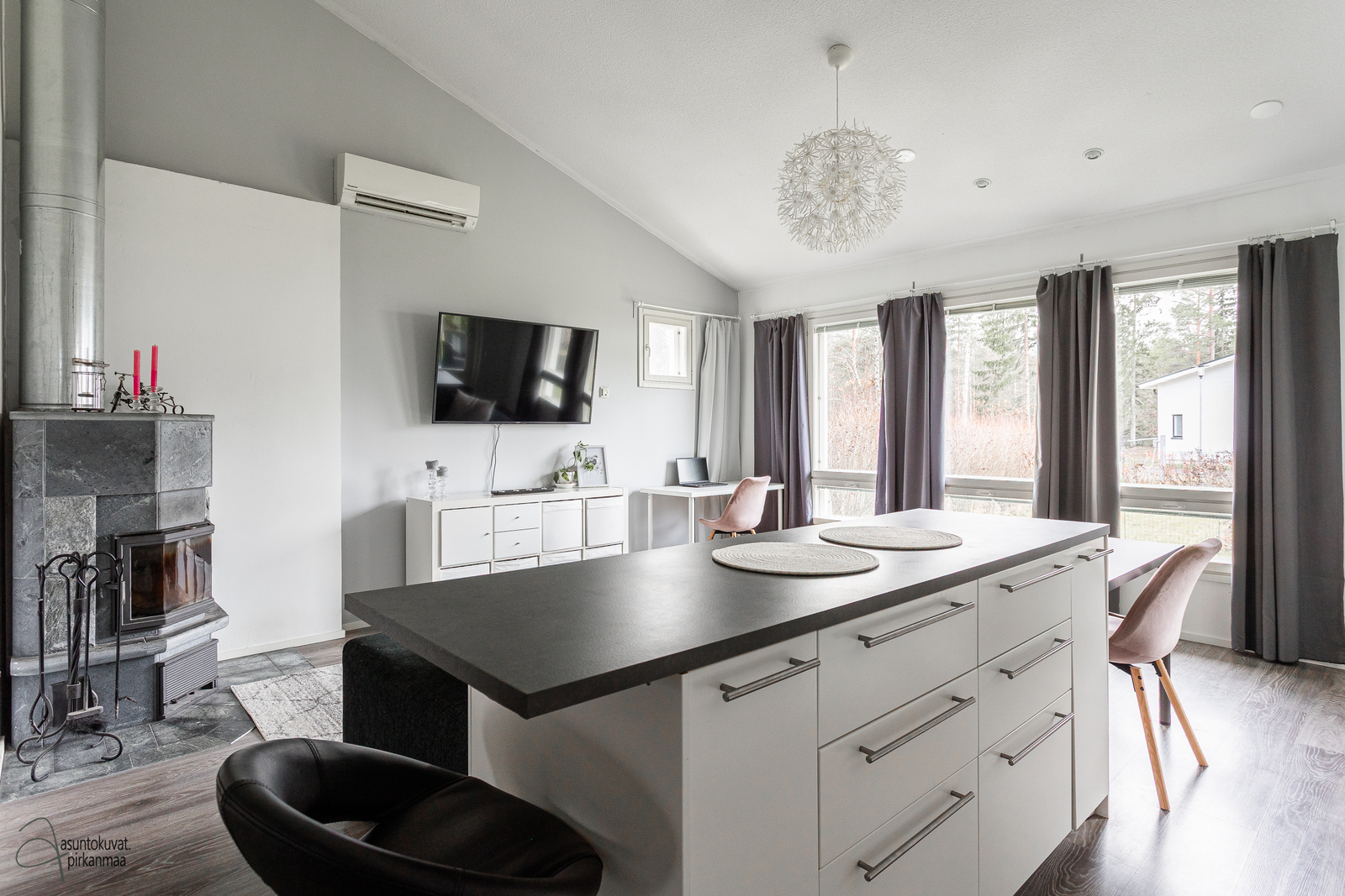 Olohuone ja avokeittiö muodostavat yhtenäisen tilan, jonka korkea viistokatto luo avaruutta ja luonnonvaloa. Keittiössä on saareke, joka rajaa keittiötilaa ja tarjoaa lisätyötasoa ruoanlaittoon. Varaava takka luo tunnelmaa, ja lattialämmitys yhdessä ilmalämpöpumpun kanssa pitää sisäilman miellyttävänä. Makuuhuoneet ovat tilavia, ja saunatilat sekä erillinen wc on pidetty nykyaikaisina. Kodinhoitohuoneesta pääsee suoraan ulos, autokatokseen ja varastotiloihin, mikä tekee arjesta vaivatonta.