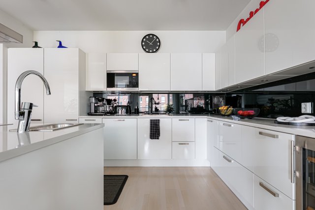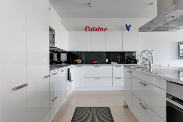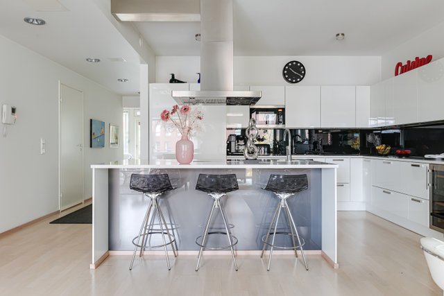 - Jääkaappi, erillinen pakastin, mikroaaltouuni, erillisuuni, astianpesukone, liesi, keittiösaareke, liesituuletin, ja viinikaappi