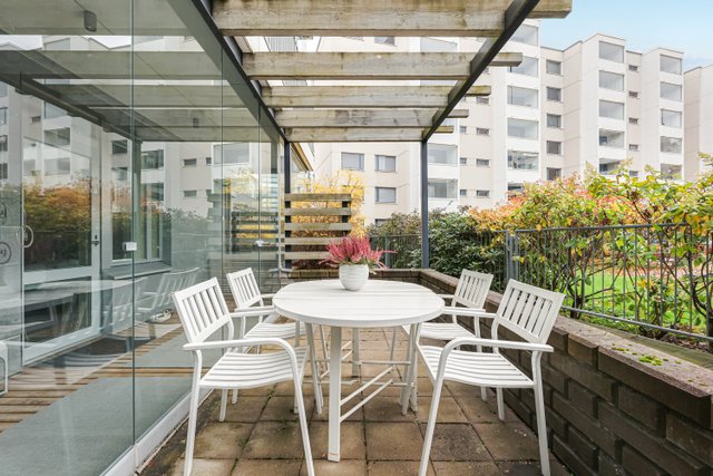 Oma lasitettu terassipiha ja lisäksi oma piha pöytäpaikalla.