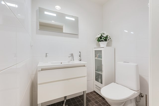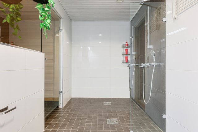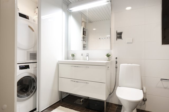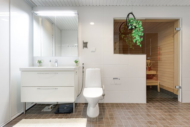 - WC-istuin, suihku, pesukoneliitäntä, lattialämmitys, bidee-suihku, allaskaappi, pesuallas, peili, ja suihkuseinä