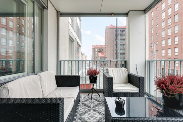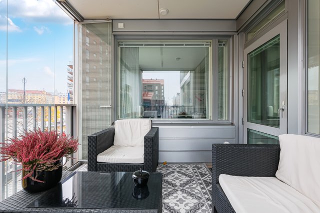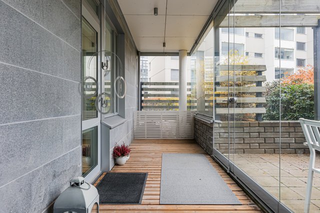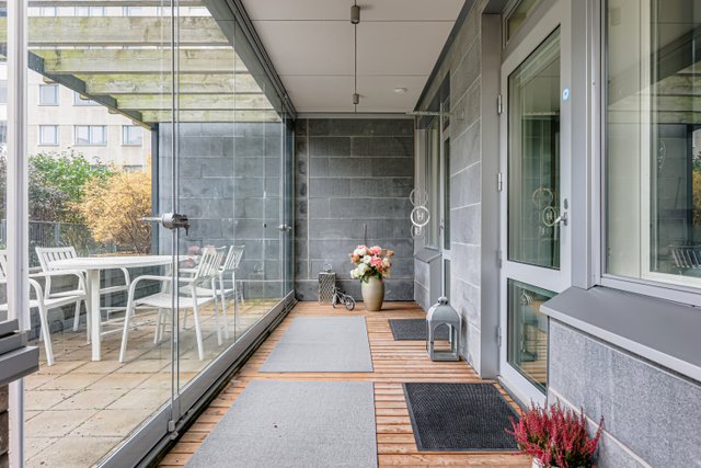 Meripuolella iso lasitettu terassiparveke, josta ruotsinlaivojen näkee lipuvan ohi.