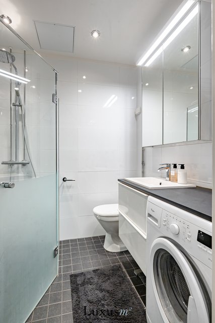 - Seinät kaakeloitu, lattia laattaa. Peili-ja allaskaappi. Pesukoneliitäntä. Wc-istuin. Sadesuihku, suihkuseinä.
