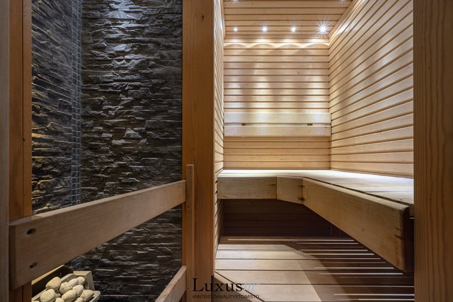 - Kompakti sauna. Tehosteseinä. Puulauteet, lattia laattaa.