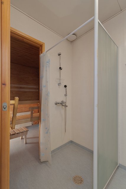 - Varustus: Sähkökiuas. Lattia: muovi Seinät: paneeli Katto: paneeli