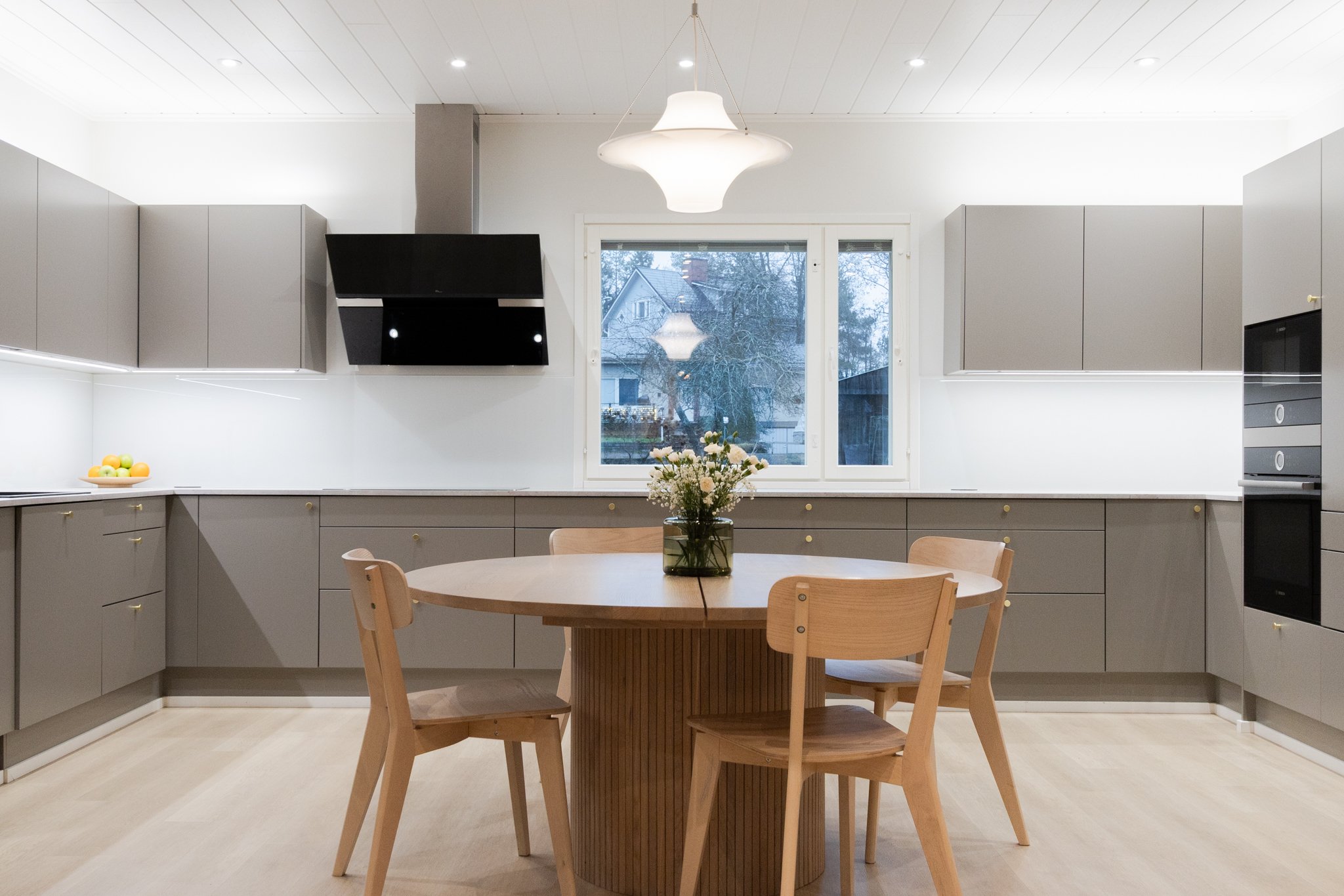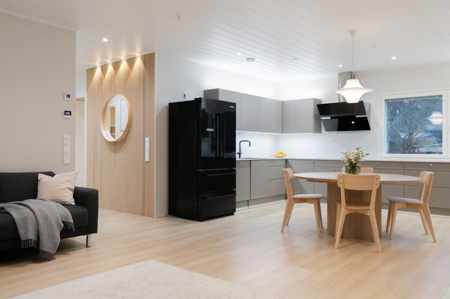 Avara pohjaratkaisu ja suuret ikkunapinnat tuovat runsaasti luonnonvaloa sisätiloihin ja luovat ilmavan tunnelman. Olohuoneen ja keittiön toimiva kokonaisuus kutsuu viettämään yhteisiä hetkiä perheen ja ystävien kanssa. Keittiö on varusteltu nykyaikaisilla kodinkoneilla, sekä runsaalla kaappitilalla, tarjoten hyvät puitteet arjen ruoanlaittoon.