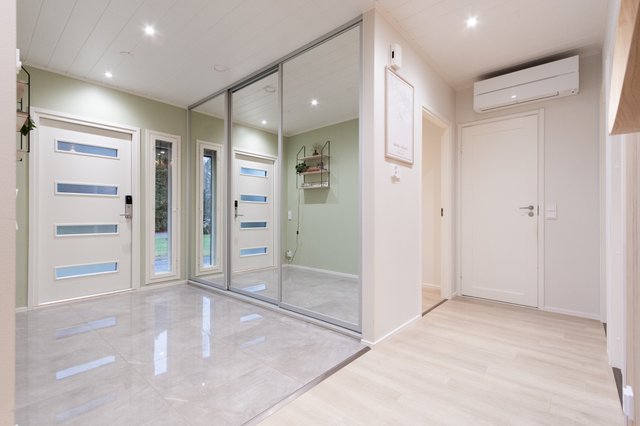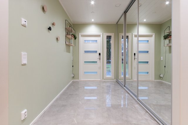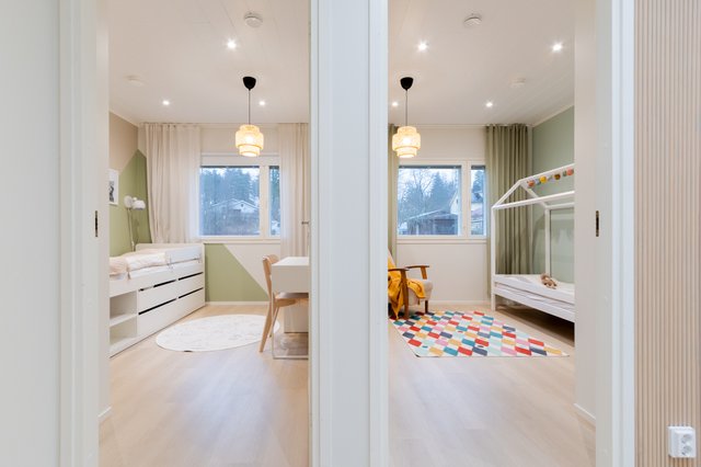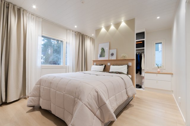 Talossa on neljä tilavaa makuuhuonetta, jotka soveltuvat mainiosti perheen tarpeisiin tai esimerkiksi työ- ja vierashuoneiksi. Kylpyhuoneessa ja kodinhoitohuoneessa on miellyttävä lattialämmitys, ja oma sauna kruunaa kokonaisuuden tarjoten rentouttavia hetkiä arjen keskellä. Käytännöllisestä kodinhoitohuoneesta on oma uloskäynti, joka helpottaa arkea.