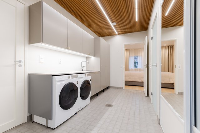 - Pesukoneliitäntä, lattialämmitys, pyykkikaapit, ja pöytätaso