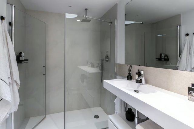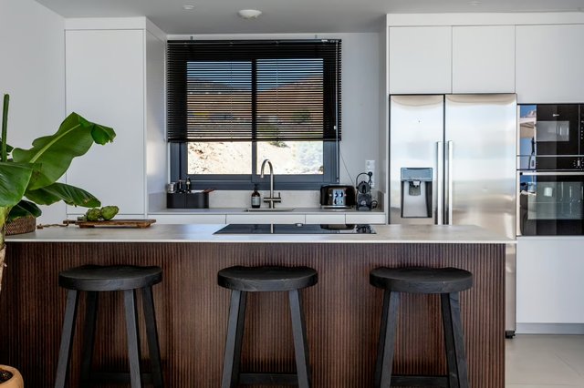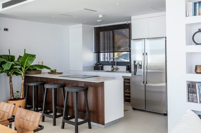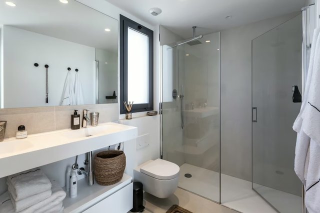 All three bedrooms feature double beds (master bedroom 180 m2, others 160 m2) and offer full sea views. Two bedrooms include practical writing desks, creating an ideal work environment. The property boasts underfloor heating, high-quality appliances, and air conditioning throughout.
