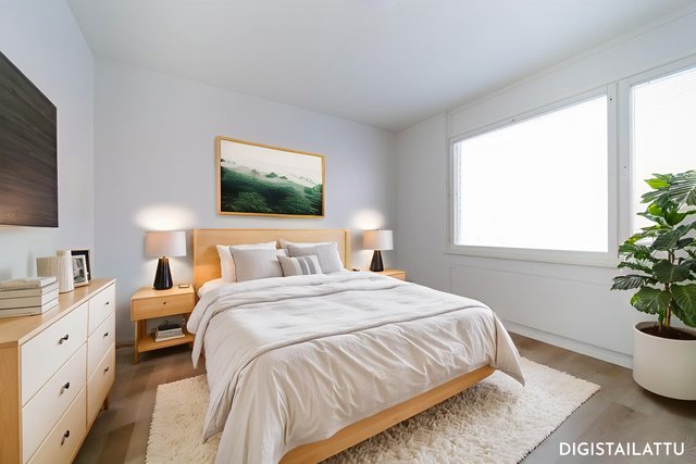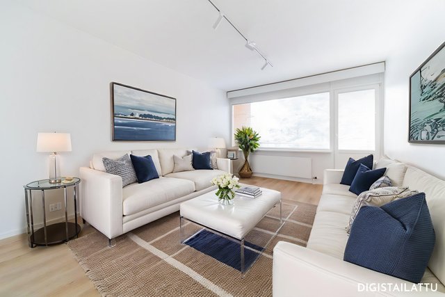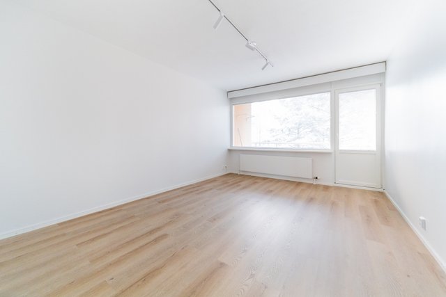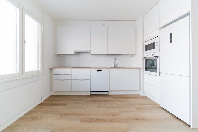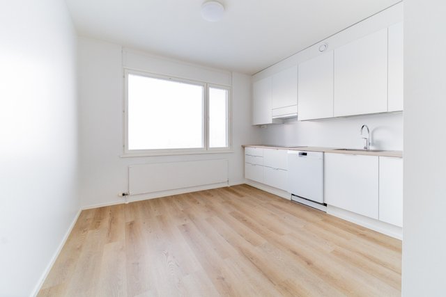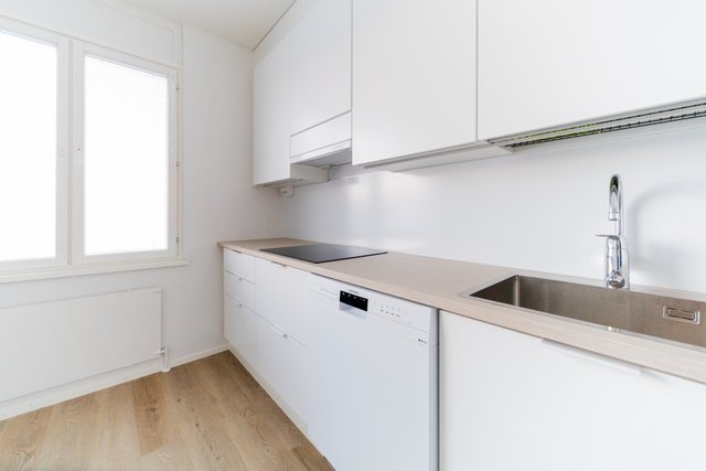 Asunnon täysin uusitussa keittiössä on tyylikkäät vaaleat pinnat sekä moderni varustus. Kodin lattiat on vaihdettu kauniiseen vinyylilankkuun. Moderni valaistus sekä ikkunat kahteen suuntaan luovat kotiin raikkaan ja valoisan ilmeen.