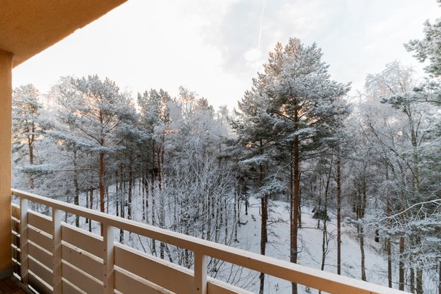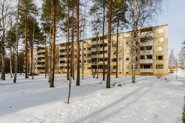 Läpitalon asunto tarjoaa olohuoneesta rauhalliset näkymät puiston puolelle ja keittiöstä sekä makuuhuoneesta avoimet maisemat kauas talojen ylle.
