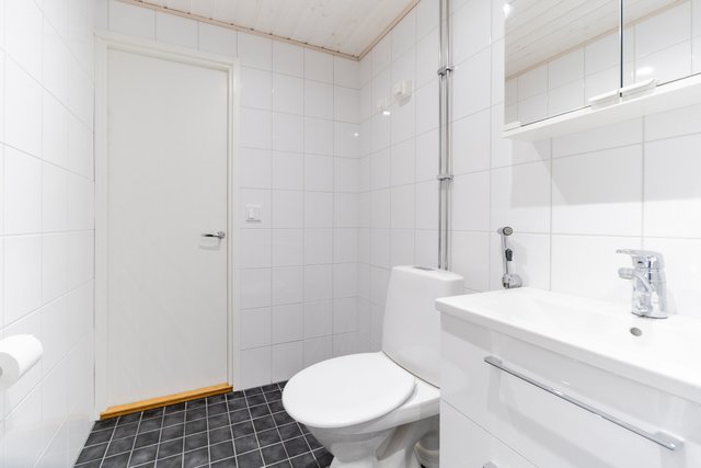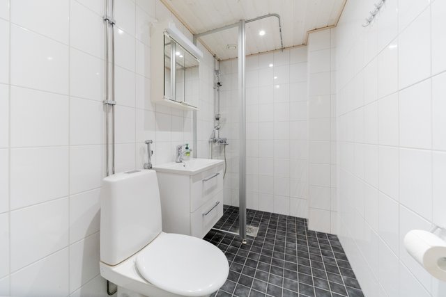 - WC-istuin, suihku, lattialämmitys, peilikaappi, pesuallas, allaskaappi, bidee-suihku, suihkuseinä, ja pesukoneliitäntä