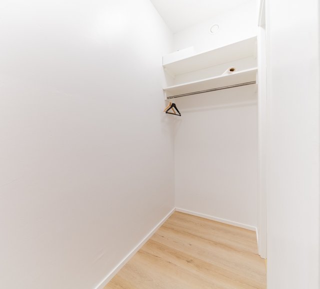 Tilava makuuhuone tarjoaa tilaa parisängylle sekä työpisteelle taikka kaapistolle, ja eteistilassa on kätevä vaatehuone peililiukuovin.