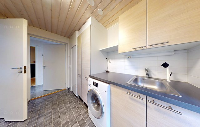 - Lattialämmitys, pesuallas, lattiakaivo, kurapiste, pöytätaso, keskuspölynimuri, pesukoneliitäntä, ja pyykkikaapit