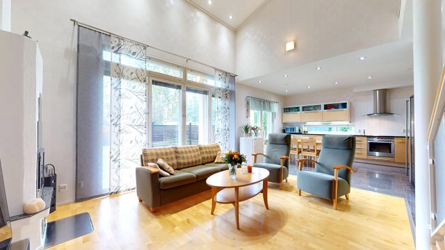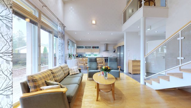 - Korkea huonekorkeus, sekä lattiatasosta lähtevät isot ikkunat tuovat tilaan hyvin luonnonvaloa. Kulku ulos terassille. Himmennettävä varaistus. Varaava takka. Tietoliikenne pistorasia (mahdollistaa TV:n ja nettiyhteyden)