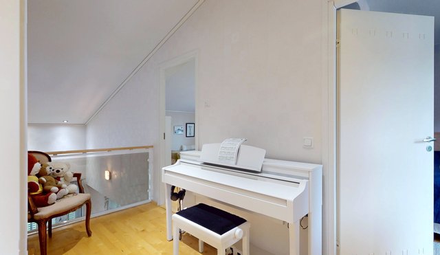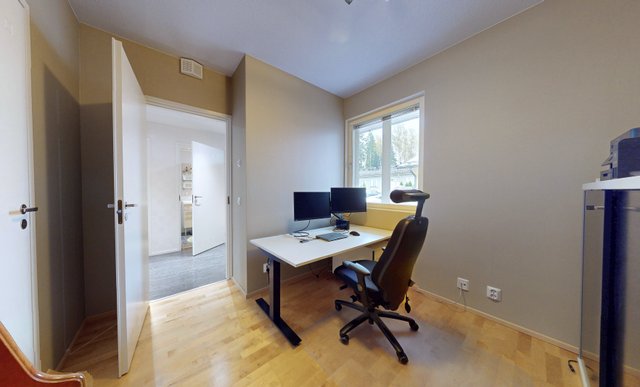 - Kolme makuuhuonetta yläkerrassa, joissa yhdessä on myös vaatehuone ja toisessa liukuovikaapisto sekä keskuspölynimuriliitäntä. Yksi makuuhuone alakerrassa, joka nyt ollut työhuone käytössä ja jossa myös vaatehuone. Kaikissa makuuhuoneissa tietoliikenne pistorasiat (mahdollistaa TV:n ja nettiyhteyden).