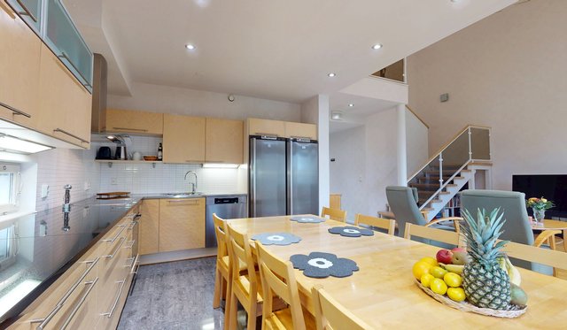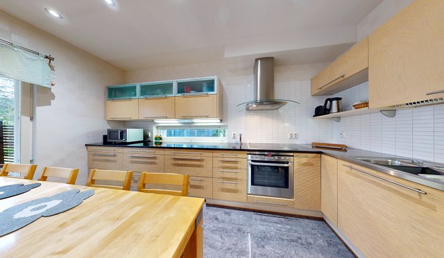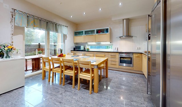 - Laadukas ja avara keittiö, Puustellin kaapistoilla ja kivitasoilla, jossa hyvin laskutilaa. Välitilassa luonnonvaloa antaa välitilaikkuna. Himmennettävä valaistus. Tietoliikenne- pistorasia (mahdollistaa TV:n ja nettiyhteyden)