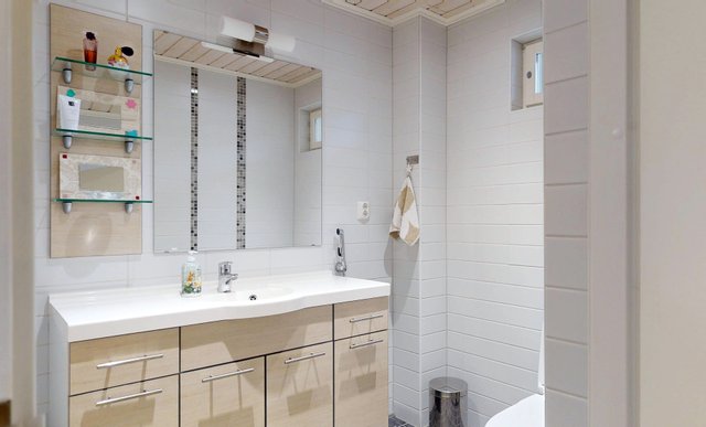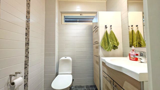 - Molemmissa kerroksissa omat wc-tilat. Yläkerran wc:ssä olemassa myös suihkuvarus. Alakerran wc tilan käyttömukavuutta lisää toinen ovi suoraan kodinhoitohuoneeseen, joka on pesuhuoneen vieressä. Molemmissa wc tiloissa Puustellin kaapistot.